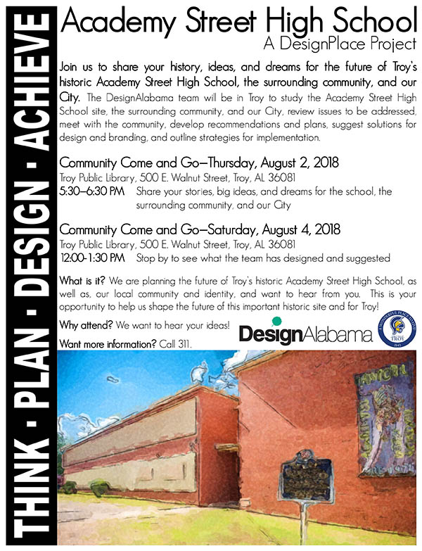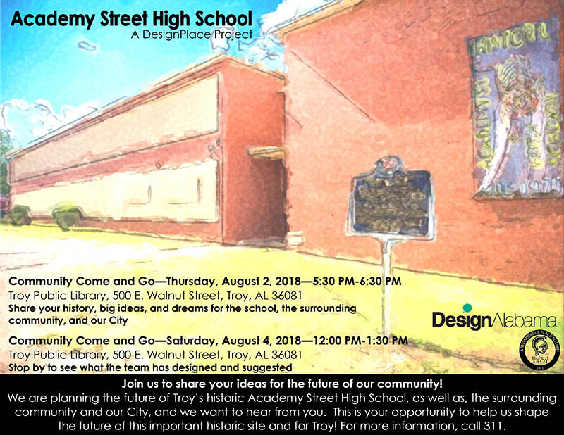 Join us to share your history, ideas, and dreams for the future of Troy’s historic Academy Street High School, the surrounding community, and our City. The DesignAlabama team will be in Troy to study the Academy Street High School site, the surrounding community, and our City, review issues to be addressed, meet with the community, develop recommendations and plans, suggest solutions for design and branding, and outline strategies for implementation.