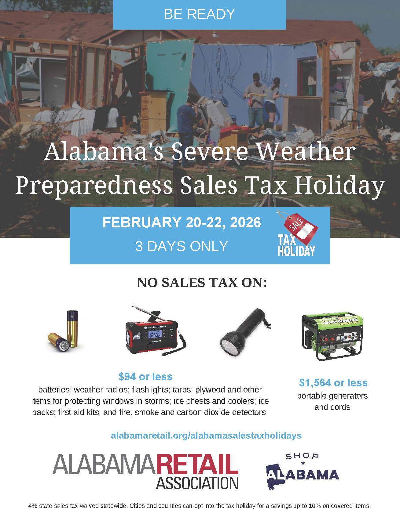 Alabama’s 15th severe weather preparedness sales tax holiday begins at 12:01 a.m. Friday, Feb. 20, 2026, and ends at midnight, Sunday, Feb. 22, 2026, allowing Alabama shoppers to stock up tax free on common supplies costing less than $94 that every home and business needs to prepare for a natural disaster or even a general emergency. Generators costing $1,564 or less also can be purchased free of the state’s four-percent sales tax during the three-day tax holiday.